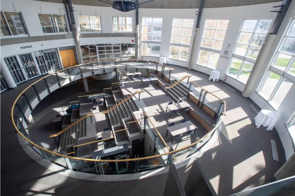 Situated at the heart of the Campus Activity Centre, this distinctive circular venue blends modern design with warm wood and brick accents—creating a striking backdrop for any event. Expansive windows fill the space with natural light and offer sweeping views of the TRU Campus Commons, bringing the outdoors in. As the building’s central corridor, this space naturally supports the smooth flow of attendees while seamlessly connecting our venues for tradeshows, cocktail receptions, and networking breaks.