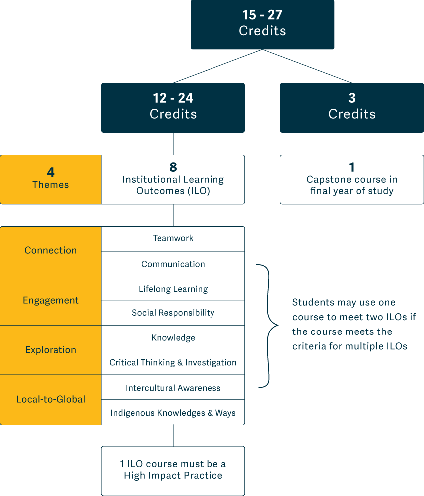 As part of their graduation requirements, all bachelor’s degree students complete credits that ensure they achieve each of the eight institutional outcomes through their studies. In addition, students are guaranteed at least one high impact learning experience and take a capstone course in their final year of study.
